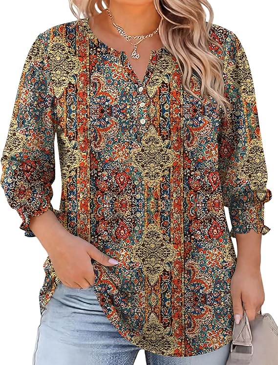 • Plus Size Tops 3/4 Length Sleeve Womens Tops Casual V Neck Loose Fit Blouses 1X-5X
